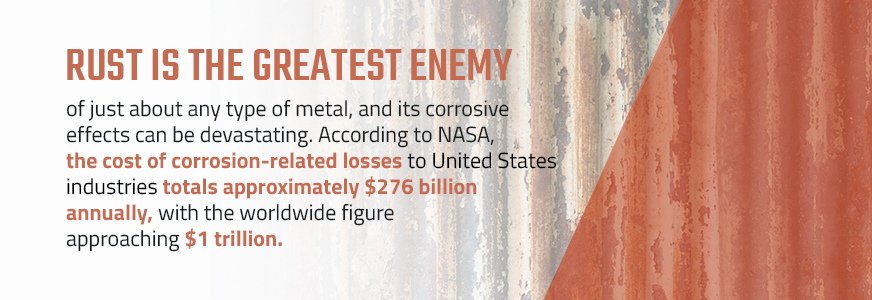 Rust is the greatest enemy of just about any type of metal, and its corrosive effects can be devastating. According to NASA, the cost of corrosion-related losses to United States industries totals approximately $276 billion annually, with the worldwide figure approaching $1 trillion. The industries most heavily impacted by corrosion include production and manufacturing, transportation, government, utilities and infrastructure.