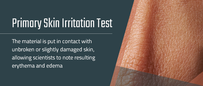- Primary skin irritation test: The material is put in contact with unbroken or slightly damaged skin, allowing scientists to note resulting erythema and edema.