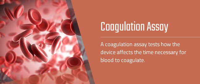 - Coagulation assay: A coagulation assay tests how the device affects the time necessary for blood to coagulate. Examples include the prothrombin time assay and the partial thromboplastin time assay.