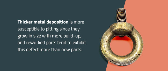 Another common issue is pitting, which is essentially small holes on the surface of the object. They appear due to the adhesion of air or hydrogen bubbles2 on the part being plated. Thicker metal deposition is more susceptible to pitting since they grow in size with more build-up, and reworked parts tend to exhibit this defect more than new parts.