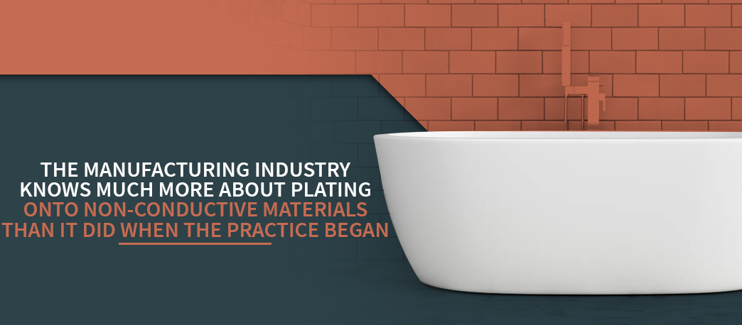 Some examples of non-conductive materials include paper, glass, rubber, porcelain, ceramic and plastic. Of these materials, glass, ceramic and plastic are standard throughout a variety of industries and are often plated with metal to alter their appearance and physical properties. Plated non-conductive materials are particularly popular within the following sectors.