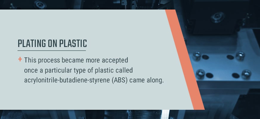 Plating onto plastic originates back to the 1960s. People doubted this process at first, as it took a lot of work and determination to make it function as it needed to. However, this process became more accepted once a particular type of plastic called acrylonitrile-butadiene-styrene (ABS) came along.
