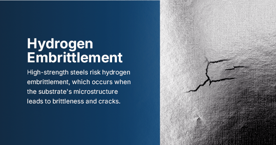 High-strength steels risk hydrogen embrittlement, which occurs when the substrate’s microstructure leads to brittleness and cracks.21 The most effective solution is post-plate baking, which allows hydrogen to diffuse out of the material. With this intermediate step, teams reduce the risk of high-strength steel failure in service.
