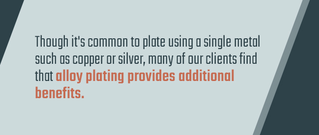 Though it’s common to plate using a single metal such as copper or silver, many of our clients find that alloy plating provides additional benefits. The following are a few common alloys used in plating today: